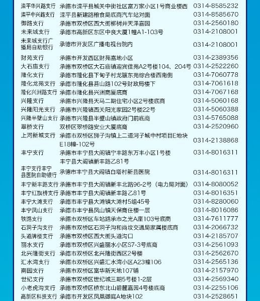 总行地址:河北省承德市世纪城三期5号楼 邮编:067000