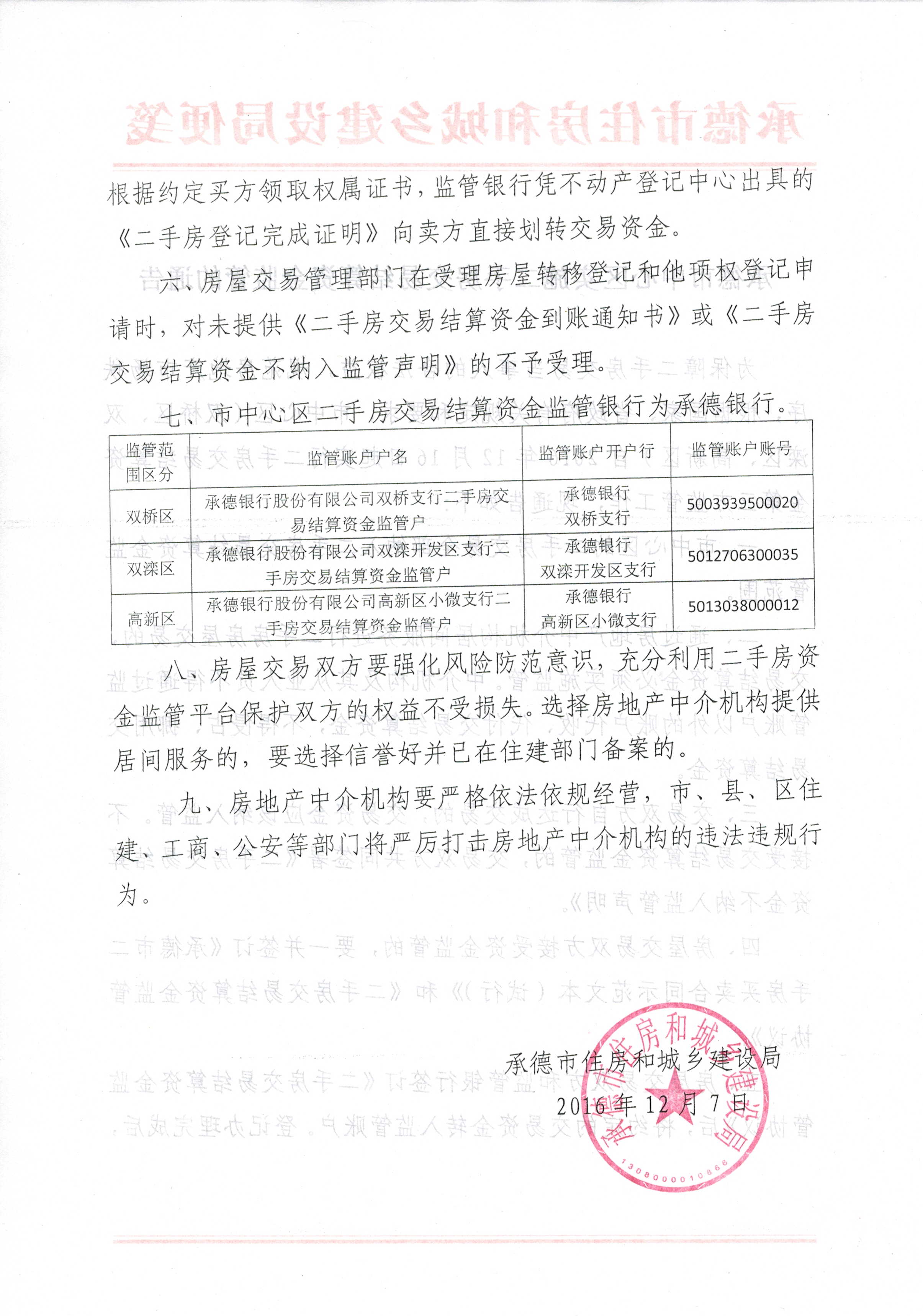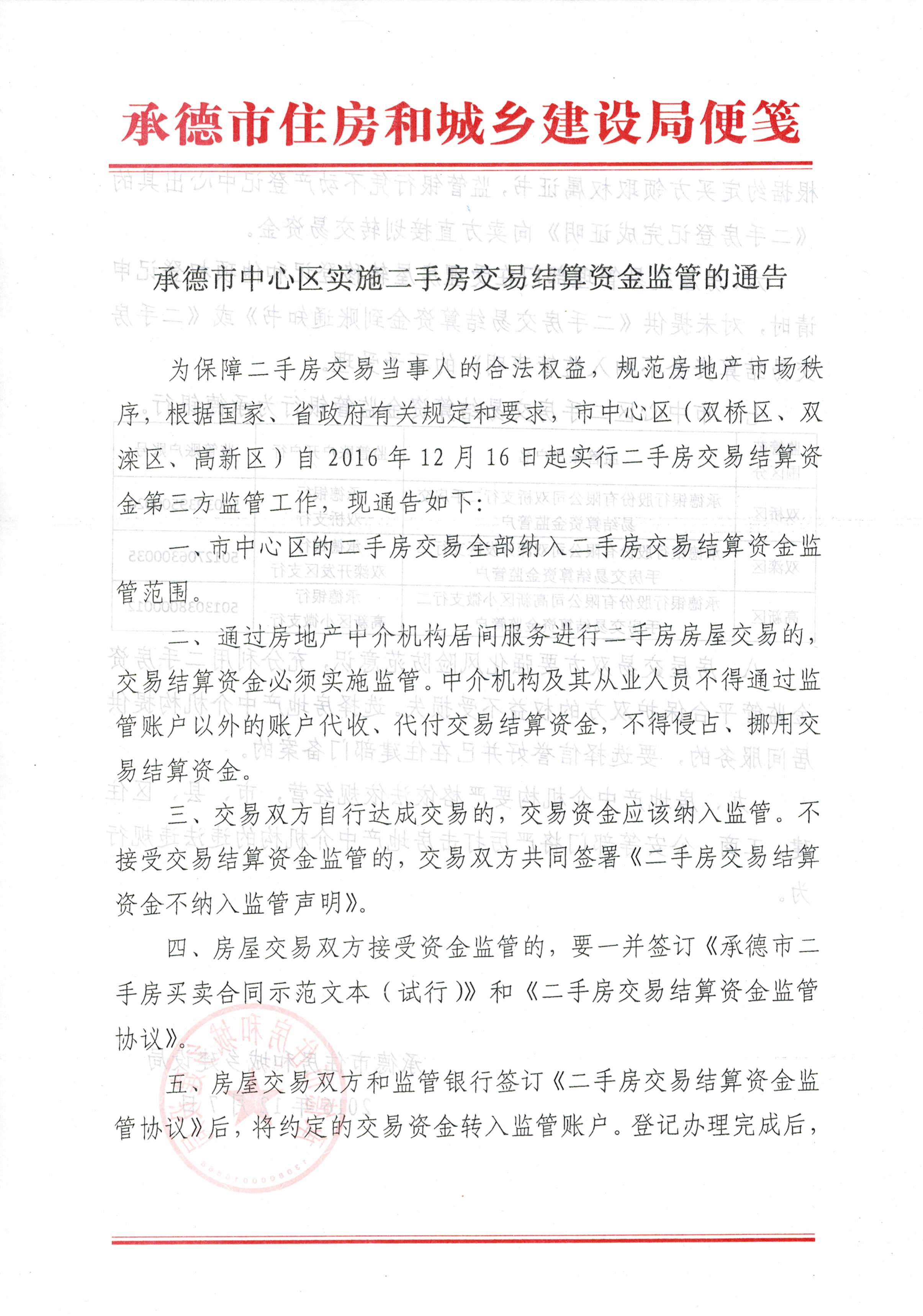 现将承德市住房和城乡建设局发布的《承德市中心区实施二手房交易结算资金监管的通告》全文刊登如下:
